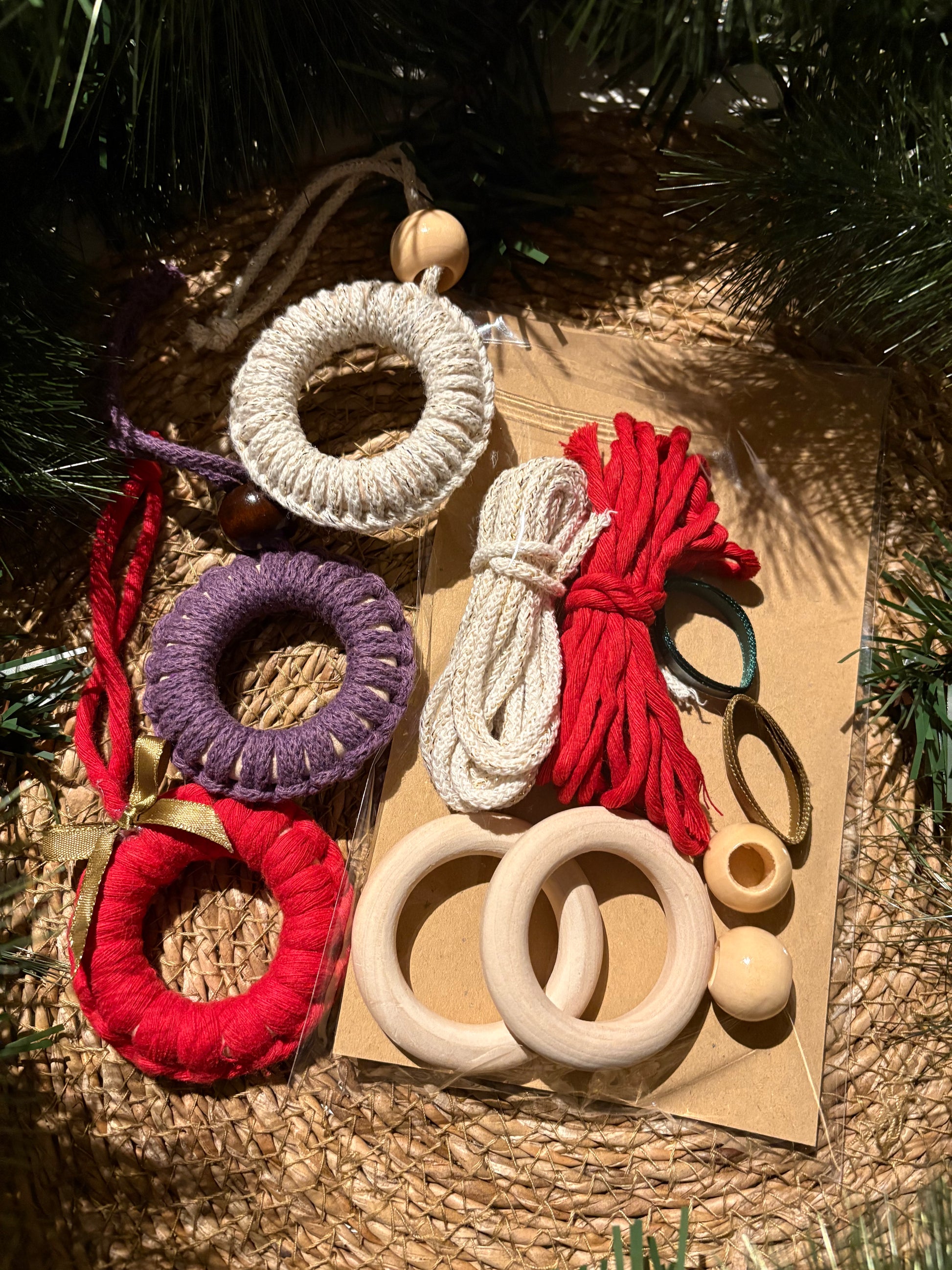 Í pokanum er efniviður til að föndra tvo macramé jólahringi. Þú skannar QR kóða á pokanum sem flytur þig á kennslumyndband á Youtube-rás Flóðs & fjöru