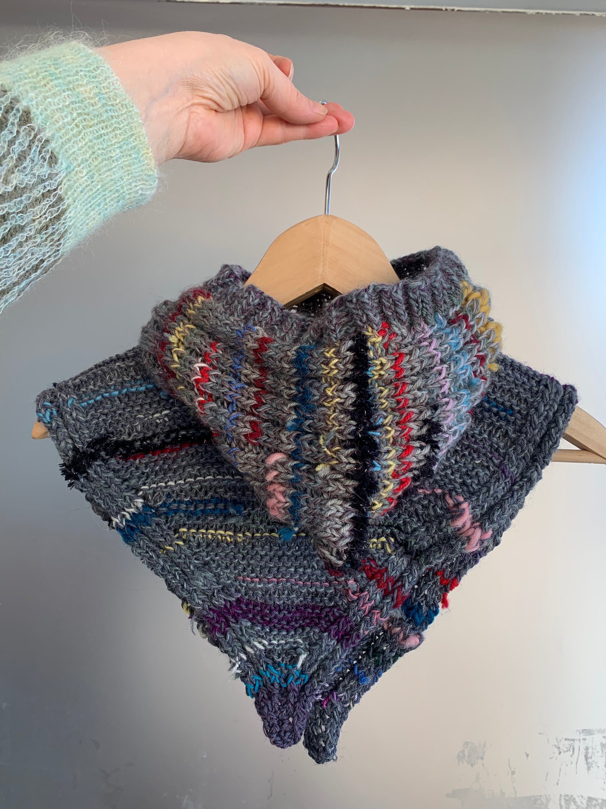 Handprjónuð mjúk og hlý hetta úr blönduðum þráðum